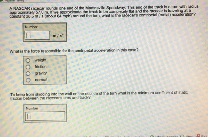 If we approximate the track to be completely flat and the racecar is traveling at a to keep from skidding into the wall on the outside of the turn what is the minimum coefficient of static friction between the racecar\'s tires and track? Short, intermediate, superspeedway and road course. If the track is completely flat and the race car is traveling at a constant 30.5 m/s to keep from skidding into the wall on the outside of the turn what is the minimum coefficient of static friction between the racecar\'s tires and track? Martinsville speedway removing some seats: Gander outdoors truck series past race winners at martinsville speedway.